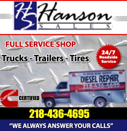Hanson Sales does everything from a tire change to an engine overhaul. We are Cummins certified and have all the diagnostic tools for all major engines. We are located at 1181 420th Ave in Karlstad, MN and have a 9 bay facility with skilled mechanics ready to take on any job! Our services include: